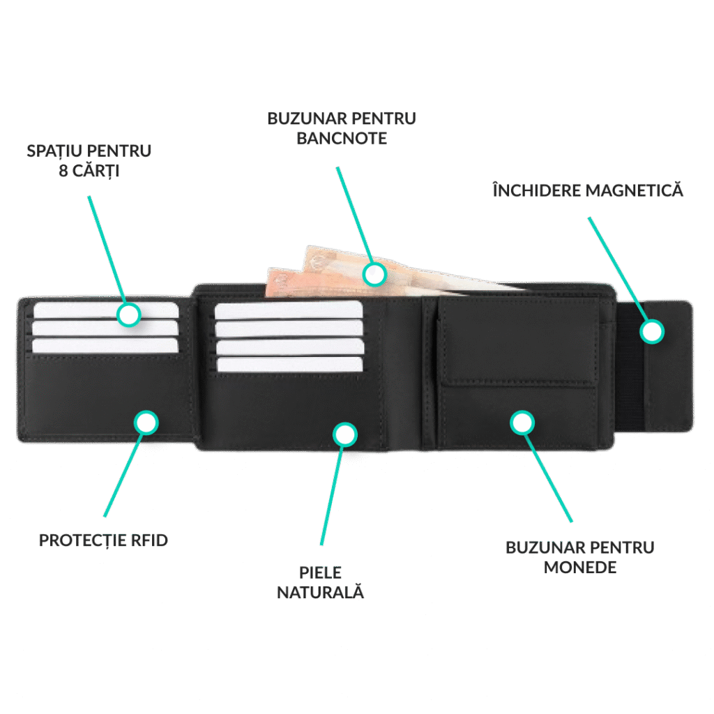 - Închidere magnetică – securizează portofelul și protejează conținutul împotriva deschiderii accidentale