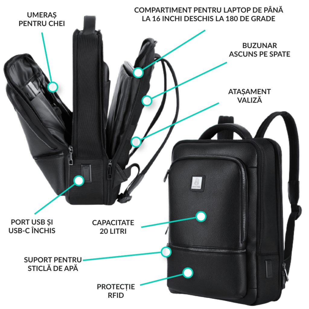 - Compartiment cu deschidere la 180 de grade pentru laptop de până la 16″ și accesorii