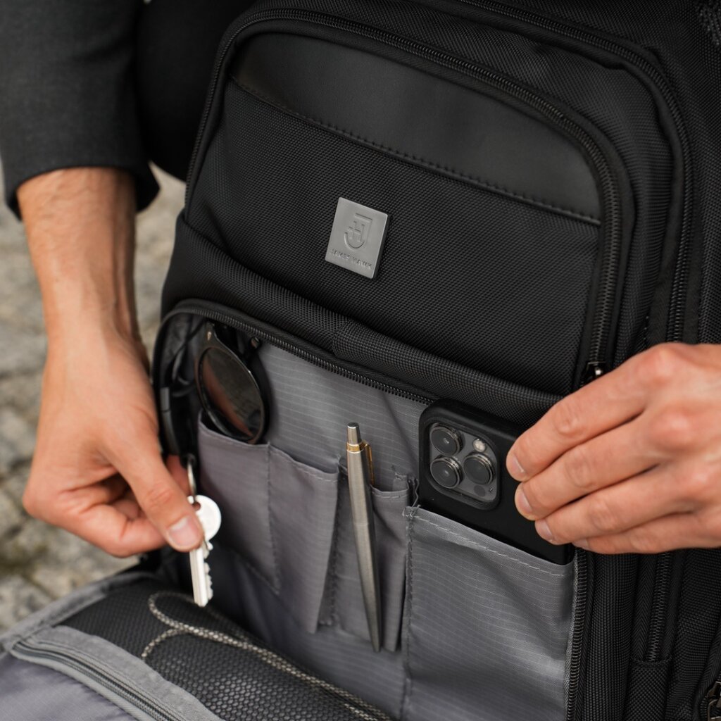 - Compartimente pentru pixuri, baterie externă și pașaport